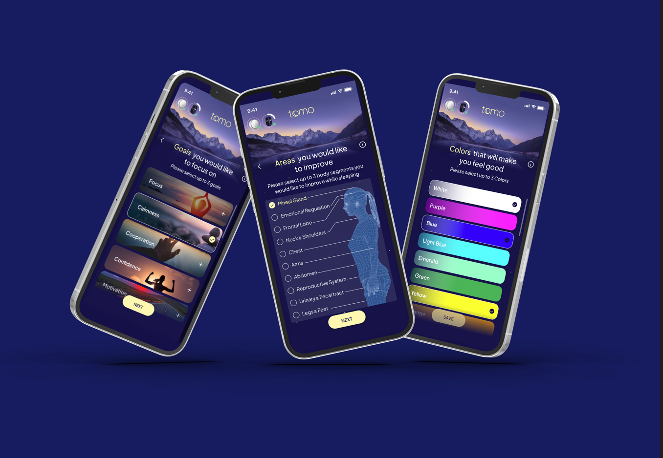 Tomo combines cutting-edge color and sleep wave therapies that are designed to create a soothing environment, enhance relaxation, and promote mental balance. By answering 3 questions about the aspects on which you would like Tomo to focus - our unique smart algorithm will create the best plan for your mind, emotions, and body. This plan will be transmitted to you throughout your rejuvenating sleep. Selecting (up to) 3 goals, 3 areas and 3 colors will provide Tomo’s AI with all the information needed to create a tailored sleep plan.
